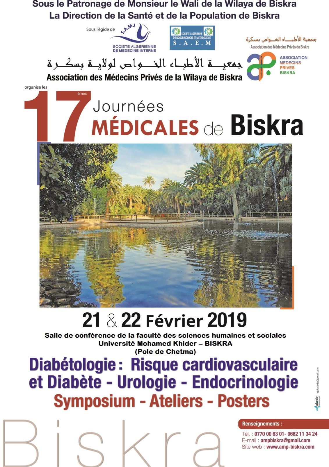 21 & 22 Février 2019 Salle de conférence de la faculté des sciences humaines et sociales Université Mohamed Khider -Biskra- (Pole de Chetma) Théme: -Diabétologie. -Risque cardiovasculaire -Endocrinologie. -Urologie.