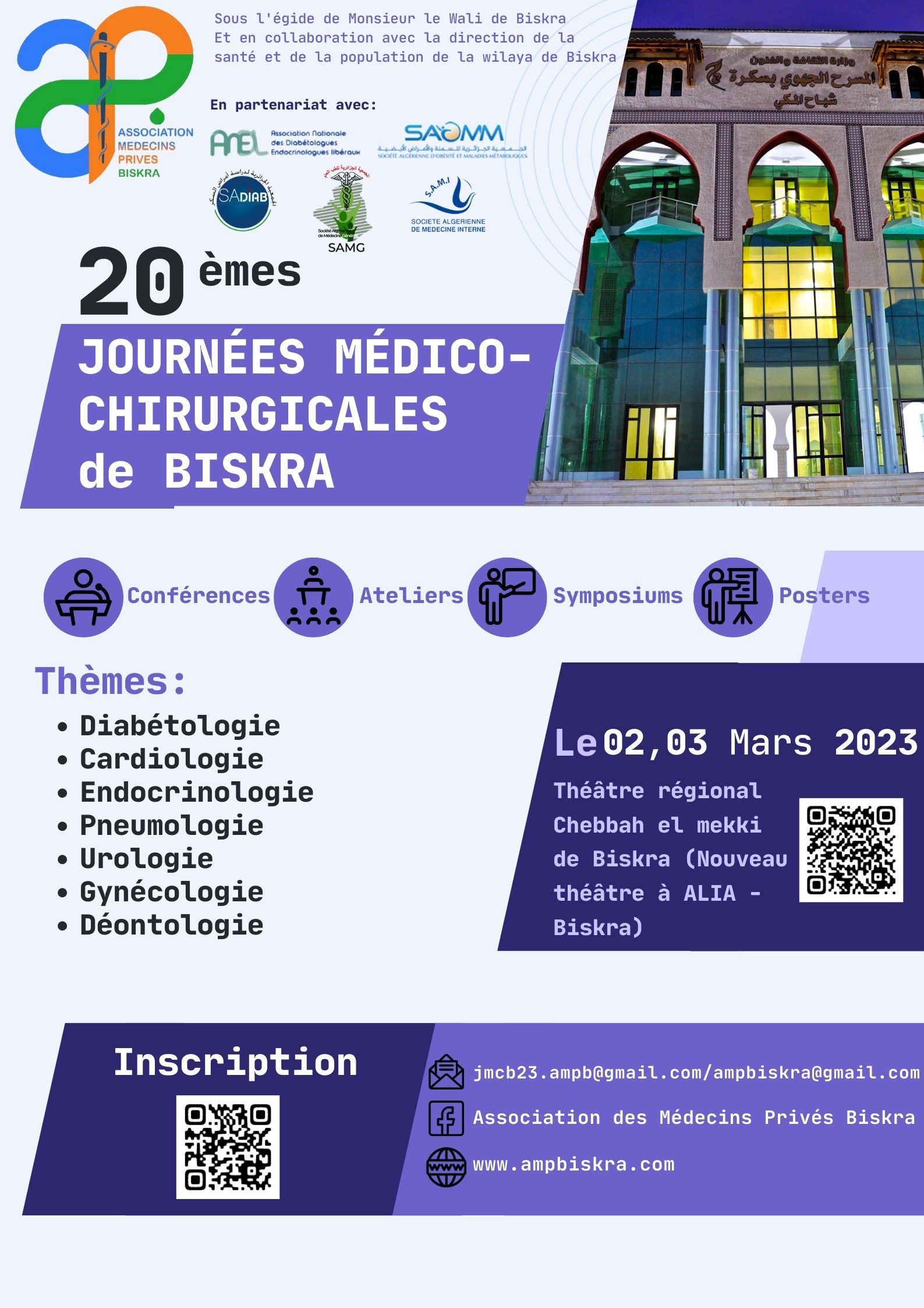 Comme veut la tradition et un mois de l’événement, j’ai le plaisir et l’honneur de vous annoncer la tenue des 20ièmes journées medico-chirurgicales de Biskra les 02 & 03 mars 2023 au luxueux nouveau théâtre régional Chebbah El Mekki de Biskra avec un programme très riche et magistralement animé par nos éminents spécialistes des thèmes des journées.